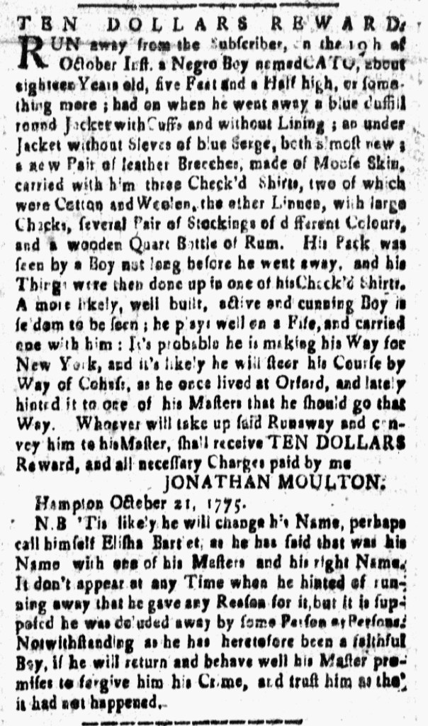 Jonathan Moulton’s advertisement describing Bartlet was about three times the length of Marifield Berry’s advertisement about Peter Long and Gould French’s advertisement about Oliver. Moulton reported on the clothes that Bartlet wore when he departed, noting that he “carried with him three Check’d Shirts [and] several Pair of Stockings of different Colours.” Apparently, Bartlet had been spotted by a boy who observed that “his Things were then done up in one of Check’d Shirts” as a pack that he carried. Moulton suspected that the man he called Cato would “change his Name, perhaps call himself Elisha Bartlet, as he has said that was his Name with one of his Masters and his right Name.” Although not his intention in placing the advertisement, Moulton revealed Bartlet’s commitment to self-determination in naming himself. It did not matter to Bartlet what Moulton or any other enslaver called him at their own whim. He considered Elisha Bartlet his true name, though Moulton did not share enough of the enslaved man’s story to explain why that was the case.