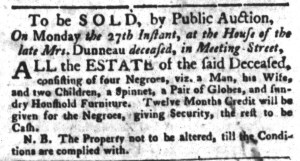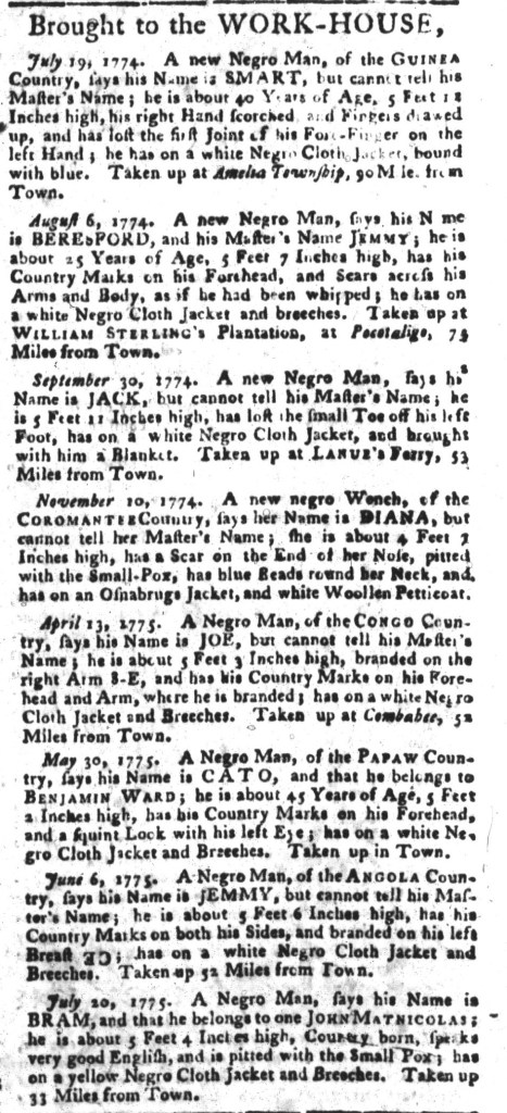 The Slavery Adverts 250 Project chronicles the role of newspaper advertising in perpetuating slavery in the era of the American Revolution. The project seeks to reveal the ubiquity of slavery in eighteenth-century life from New England to Georgia by republishing advertisements about enslaved people – for sale as individuals or in groups, wanted to purchase or for hire for short periods, runaways who liberated themselves, and those who were subsequently captured and confined in jails and workhouses – in daily digests on this site as well as in real time via the @SlaveAdverts250 Twitter feed, utilizing twenty-first-century media to stand in for the print media of the eighteenth century.