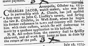 After his partnership with Abraham Claude ended, watchmaker Charles Jacob opened his own shop in Annapolis in the fall of 1775. He placed an advertisement in the Maryland Gazette in hopes that “his former customers in town and country will favour him with their custom,” though he also intended for the notice to draw the attention of new customers. Mentioning both his partnership with Claude and the clientele they had established demonstrated to prospective new customers that Jacob had the experience to serve them well. In addition, he pledged “constant application to his business” or, in other words, an industriousness that customers would find more than satisfactory.