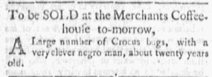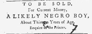 The Slavery Adverts 250 Project chronicles the role of newspaper advertising in perpetuating slavery in the era of the American Revolution. The project seeks to reveal the ubiquity of slavery in eighteenth-century life from New England to Georgia by republishing advertisements about enslaved people – for sale as individuals or in groups, wanted to purchase or for hire for short periods, runaways who liberated themselves, and those who were subsequently captured and confined in jails and workhouses – in daily digests on this site as well as in real time via the @SlaveAdverts250 Twitter feed, utilizing twenty-first-century media to stand in for the print media of the eighteenth century.