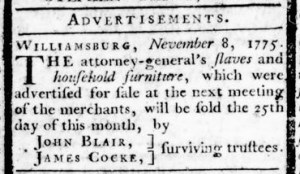 An advertisement about the upcoming sale of the “attorney-general’s slaves and household furniture” in the November 10, 1775, edition of Alexander Purdie’s Virginia Gazette was signed by John Blair and James Cocke, the “surviving trustees.” Upon learning of the death of Peyton Randolph, one of the original trustees, they had updated an advertisement that had been running in that newspaper as well as John Pinkney’s Virginia Gazette and John Dixon and William Hunter’s Virginia Gazette for several weeks. John Randolph, the King’s Attorney General for the colony and a loyalist, had departed for England, leaving his brother, Peyton, along with Blair and Cocke as trustees to oversee and sell his estate. Peyton, a patriot and the president of the First Continental Congress, was in Philadelphia representing Virginia in the Second Continental Congress when he unexpectedly died, leaving Blair and Cocke as the “surviving trustees.”