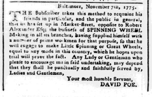 […] the same time that David Poe advertised that he “set up … the business of SPINNING WHEEL Making” in Baltimore in November 1775, Fergus McIllroy took to the pages of Dunlap’s Maryland Gazette to […]