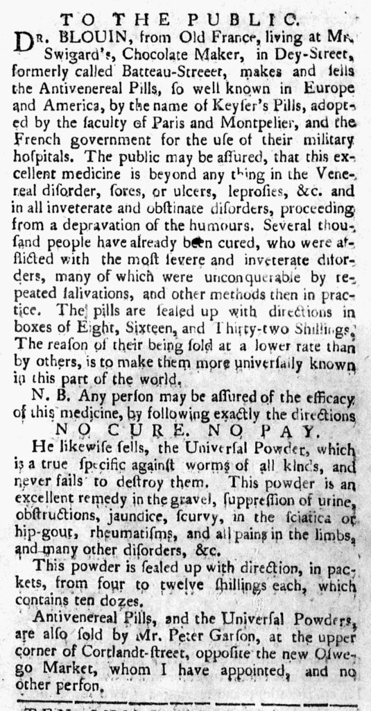 Blouin offered a brief history of the original medication as a means of marketing his generic version, noting that Keyser’s Pills had been “adopted by the faculty of Paris and Montpelier, and the French government for the use of their military hospitals.” Furthermore, “[s]everal thousand people have already been cured, many of which were unconquerable by … other methods” of treatment. Prospective customers, Blouin claimed, could not find a more effective remedy: “The public may be assured, that this excellent medicine is beyond any thing in the Venereal disorder, sores, or ulcers, leprosies, &c. and in all inveterate and obstinate disorders, proceeding from a depravation of the humours.” He was so certain that he offered a guarantee: “NO CURE. NO PAY.”
