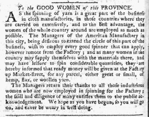 In November 1775, the proprietors or “Managers of the American Manufactory” made another appeal “To the GOOD WOMEN of this PROVINCE.” They explained that “the spinning of year is a great part of the business in cloth manufactories” and “in those countries where they are carried on extensively, and to the best advantage, the women of the whole country are employed as much as possible.” Having already engaged women “in this CITY and the SUBURBS” who responded to their previous advertisement and apparently needing even more yarn to make into textiles, the managers found themselves “desirous to extend the circle … to employ every good spinner than can apply, however remote from the Factory.” They believed that women in the countryside “may supply themselves with the materials there” and had “leisure to spin considerable quantities.” They may have been right on the first count, but perhaps overestimated how many other responsibilities wives, mothers, sisters, and daughters had in their households. For those who made the time, the managers offered “ready money … for any parcel, either great or small, of hemp, flax, or woollen yarn.”