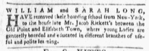 Late in November 1775, William and Sarah Long placed an advertisement for their boarding school “where young Ladies are genteelly boarded and educated in different branches of useful and polite learning” in the final edition of Rivington’s New-York Gazetteer, though they did not know that it would be the last issue. They advised prospective students and their parents that they “removed … from New-York, to the house late Mr. Jacob Rickett’s between the Old Point and Elisabeth Town” in New Jersey. What prompted the Longs to relocate outside the city? With the siege of Boston continuing, the uncertainty of where and when British soldiers would attempt to assert their authority likely played a role in their decision. A few months earlier, Andrew Wilson ran an advertisement for his grammar school in Morristown, New Jersey, emphasizing its distance from the coast. He invoked the “dangerous and alarming times [for] the inhabitants of large cities” and suggested that they “may wish to have their children educated in the interior parts of the country, at a distance from probable, sudden danger and confusion.” Similar thoughts may have inspired the Longs when they “removed” their school from New York.