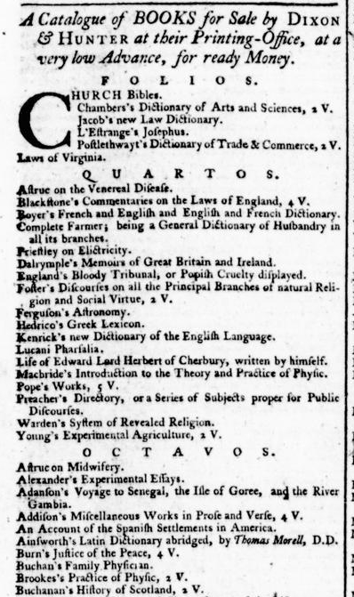 […] John Dixon and William Hunter, printers of the Virginia Gazette, published a “Catalogue of BOOKS for Sale … at their Printing-Office” in the November 25, 1775, edition. It covered most of the first page, except for the masthead and a short advertisement in which William Hewitt announced his intention to leave the colony and called on associates to settle accounts, and continued onto the second page, where it filled an entire column and overflowed into another. Overall, Dixon and Hunter’s book catalog accounted for four of the twelve columns of news and advertising in that issue. The printers could have printed a separate catalog (and very well may have done so), but disseminating the list of books they sold in the newspaper guaranteed that they reached consumers throughout the colony and beyond. The printers deployed two principles in organizing the contents of their book catalog. First, they separated the books by size – folios, quartos, octavos, and duodecimos – and then they roughly alphabetized them. Read more… […]
