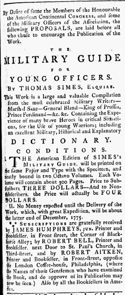 […] In December 1775, James Humphreys, Jr., Robert Bell, and Robert Aitken collaborated in advertising and publishing The Military Guide for Young Officers by Thomas Simes, making yet another military manual available to the public following the momentous events at Lexington and Concord the previous April. More recent developments, both military and political, convinced printers that a market existed for military manuals. According to the introduction to “Books in the Field: Studying the Art of War in Revolutionary America,” an exhibition sponsored by the American Revolution Institute of the Society of the Cincinnati, “a flood of printing began to appear from the American presses. Much of this activity was centered in Philadelphia, where more than thirty works on military subjects were published in the years 1775 and 1776 alone.” Of the three of the printer-booksellers who partnered in publishing Simes’s Military Guide, Humphreys was the only one who published a newspaper. He gave their advertisement a privileged place at the top of the first column on the first page of the December 2, 1775, edition of the Pennsylvania Ledger. Read more… […]