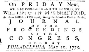 […] on a Wednesday, William Bradford and Thomas Bradford, the printers of the Pennsylvania Journal, advertised that they would publish and sell the journal of the proceedings of the Second Continental Congress from May through August starting […]