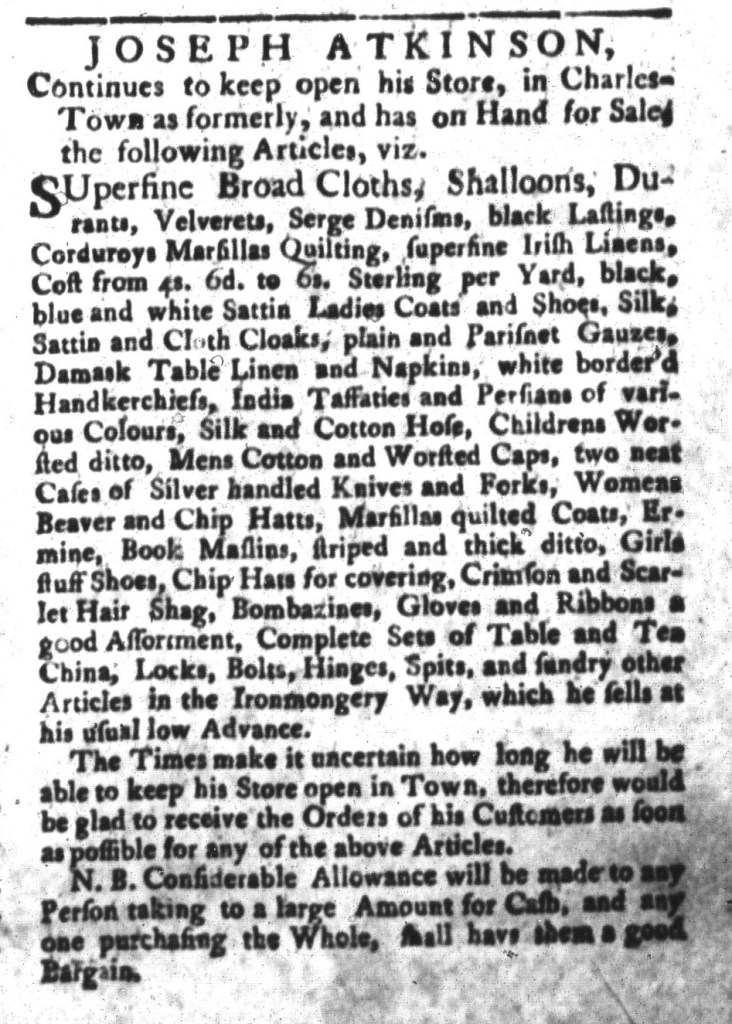 Joseph Atkinson placed an advertisement in the December 11, 1775, edition of the South-Carolina Gazette to advise prospective customers that he “Continues to keep open his Store, in Charles-Town as formerly.” He listed an array of merchandise, including a variety of textiles, “Mens Cotton and Worsted Caps, two Cases of Silver handled Knives and Forks, Womens Beaver and Chip Hats, … Gloves and Ribbons a good Assortment, Complete Sets of Table and Tea China, … and sundry other Articles in the Ironmongery Way.” Atkinson sought to liquidate his stock, declaring that “Considerable Allowance will be made to any Person taking to a large Amount for Cash.” Furthermore, “any one purchasing the Whole, shall have them at a good Bargain.”