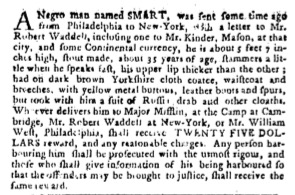 The Slavery Adverts 250 Project chronicles the role of newspaper advertising in perpetuating slavery in the era of the American Revolution. The project seeks to reveal the ubiquity of slavery in eighteenth-century life from New England to Georgia by republishing advertisements about enslaved people – for sale as individuals or in groups, wanted to purchase or for hire for short periods, runaways who liberated themselves, and those who were subsequently captured and confined in jails and workhouses – in daily digests on this site as well as in real time via the @SlaveAdverts250 Twitter feed, utilizing twenty-first-century media to stand in for the print media of the eighteenth century.