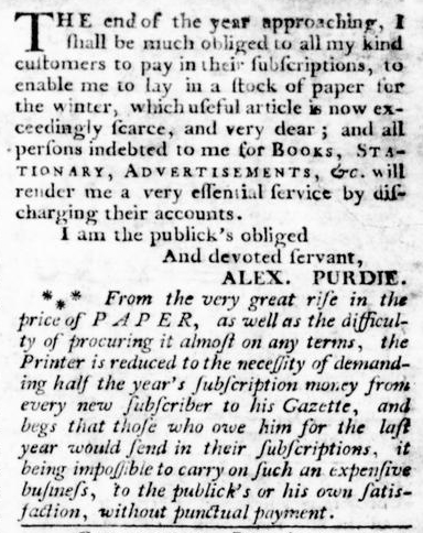 Purdie did not call on subscribers alone to settle accounts. Instead, he declared that “all persons indebted to me for BOOKS, STATIONARY, ADVERTISEMENTS, &c. will render me a very essential service by discharging their accounts.” Yet, he placed the greatest emphasis on subscribers, adding a note that underscored the price and scarcity of paper. “From the very great rise in the price of PAPER, as well as the difficulty of procuring it almost on any terms,” he proclaimed, “the Printer is reduced to the necessity of demanding half the year’s subscription money from every new subscriber to his Gazette.” Such instructions deviated from the standard narrative about how early American printers ran their businesses.
