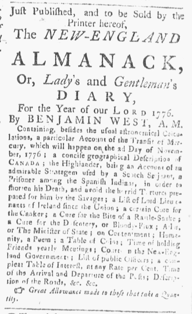 The collaboration between John Carter, the printer of the Providence Gazette, and Benjamin West, an astronomer and mathematician, continued for another year. An advertisement in the final issue of the Providence Gazette for 1775 alerted readers that the “NEW-ENGLAND ALMANACK, Or, Lady’s and Gentleman’s DIARY, For the Year of our LORD 1776” by Benjamin West was “Just Published, and to be Sold by the Printer hereof.” At the end of the advertisement, a manicule directed attention to a note that informed shopkeepers and others of a “Great Allowance made to those that take a Quantity.” In other words, Carter offered steep discounts to retailers who purchased a significant number of copies to sell to their own customers. That pricing scheme allowed them to turn a profit by setting prices that competed with customers acquiring the almanac at the printing office.