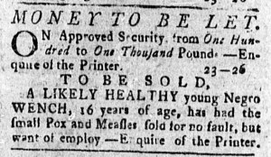 The Slavery Adverts 250 Project chronicles the role of newspaper advertising in perpetuating slavery in the era of the American Revolution. The project seeks to reveal the ubiquity of slavery in eighteenth-century life from New England to Georgia by republishing advertisements about enslaved people – for sale as individuals or in groups, wanted to purchase or for hire for short periods, runaways who liberated themselves, and those who were subsequently captured and confined in jails and workhouses – in daily digests on this site as well as in real time via the @SlaveAdverts250 Twitter feed, utilizing twenty-first-century media to stand in for the print media of the eighteenth century.