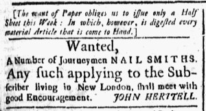 What about the advertisements? Only three paid notices appeared in that issue, one for “Journeyman NAIL SMITHS” immediately below the printer’s note on the first page and two more at the bottom of the final column on the second page. The printer concluded the issue with a brief note: “(Advertisements omitted will be in our next.)” Green assured advertisers, especially those who paid in advance of publication, that the Connecticut Gazette would indeed disseminate their notices. In this instance, however, he prioritized the needs of subscribers (many of whom did not make timely payments) and other readers (who did not pay the printer at all) over advertisers (who comprised an important revenue stream). It was a careful balancing act for all colonial printers as they served multiple constituencies simultaneously. For this issue, Green considered keeping subscribers and the rest of the public informed about “The King’s SPEECH, to both Houses of Parliament, October 26, 1775,” and news from London, Philadelphia, New York, Newport, Worcester, and Watertown (where the Continental Army continued the siege of Boston) more important than publishing many of the advertisements submitted to his printing office.