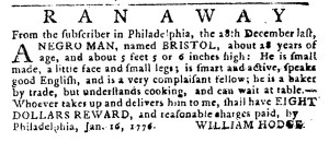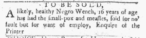 The Slavery Adverts 250 Project chronicles the role of newspaper advertising in perpetuating slavery in the era of the American Revolution. The project seeks to reveal the ubiquity of slavery in eighteenth-century life from New England to Georgia by republishing advertisements about enslaved people – for sale as individuals or in groups, wanted to purchase or for hire for short periods, runaways who liberated themselves, and those who were subsequently captured and confined in jails and workhouses – in daily digests on this site as well as in real time via the @SlaveAdverts250 Twitter feed, utilizing twenty-first-century media to stand in for the print media of the eighteenth century.