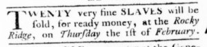 The Slavery Adverts 250 Project chronicles the role of newspaper advertising in perpetuating slavery in the era of the American Revolution. The project seeks to reveal the ubiquity of slavery in eighteenth-century life from New England to Georgia by republishing advertisements about enslaved people – for sale as individuals or in groups, wanted to purchase or for hire for short periods, runaways who liberated themselves, and those who were subsequently captured and confined in jails and workhouses – in daily digests on this site as well as in real time via the @SlaveAdverts250 Twitter feed, utilizing twenty-first-century media to stand in for the print media of the eighteenth century.