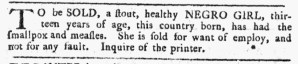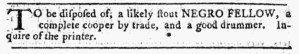 The Slavery Adverts 250 Project chronicles the role of newspaper advertising in perpetuating slavery in the era of the American Revolution. The project seeks to reveal the ubiquity of slavery in eighteenth-century life from New England to Georgia by republishing advertisements about enslaved people – for sale as individuals or in groups, wanted to purchase or for hire for short periods, runaways who liberated themselves, and those who were subsequently captured and confined in jails and workhouses – in daily digests on this site as well as in real time via the @SlaveAdverts250 Twitter feed, utilizing twenty-first-century media to stand in for the print media of the eighteenth century.