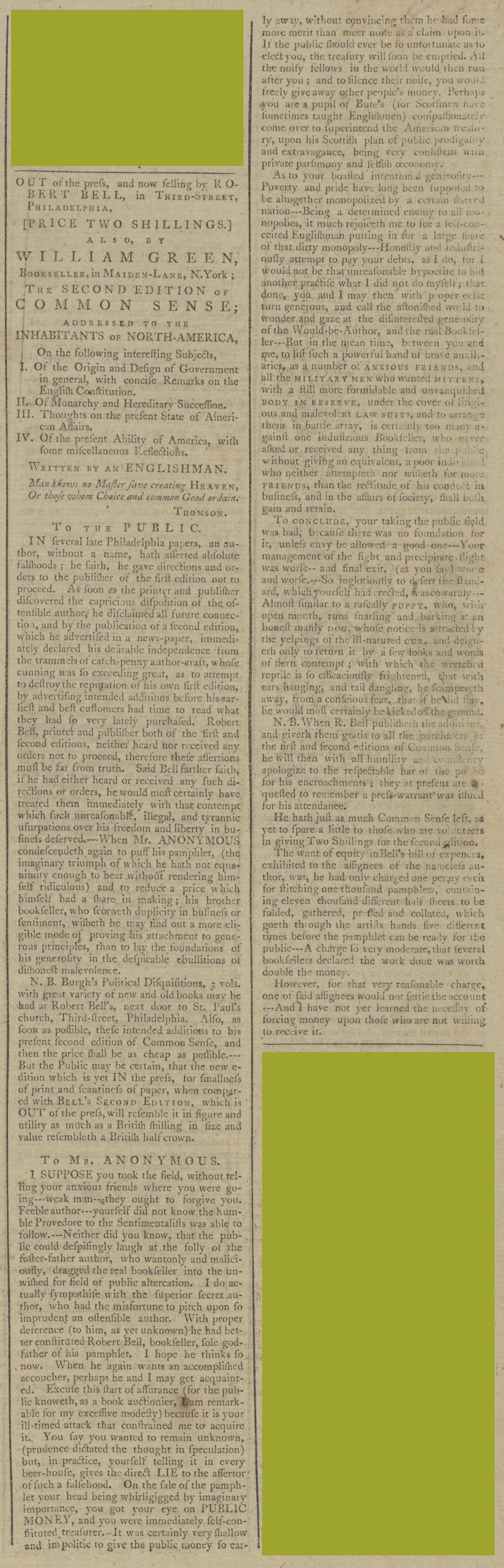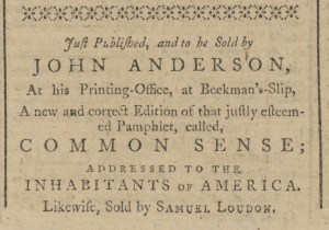 Colonizers certainly discussed Paine’s pamphlet … and printers, booksellers, and others advertised it widely. As a special feature, the Adverts 250 Project chronicles those advertisements, starting with newspaper notices for Robert Bell’s first edition published in Philadelphia and then subsequent advertisements for that and other editions published and sold throughout the colonies.