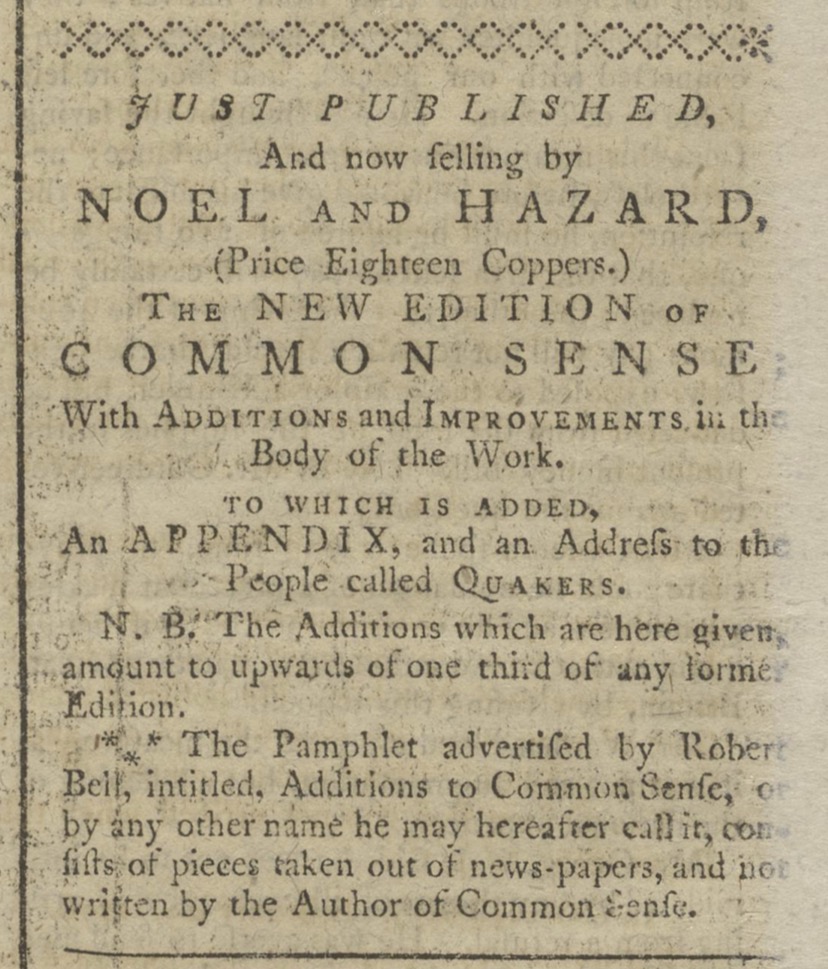 Advertisements for Common Sense Published February 29, 1776