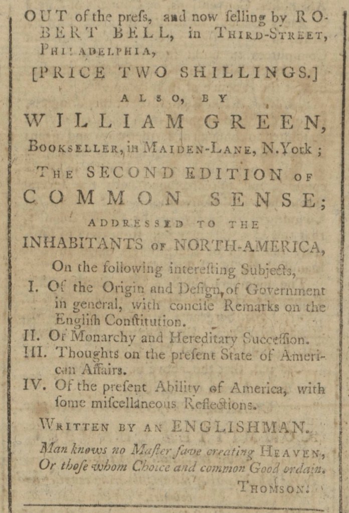 These advertisements for Common Sense appeared in American newspapers 250 years ago today.