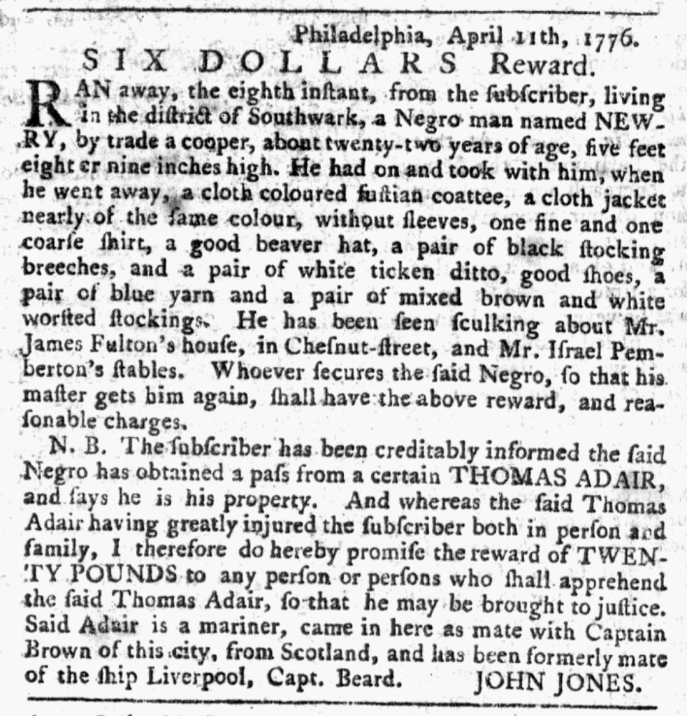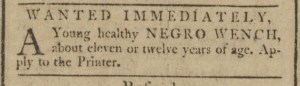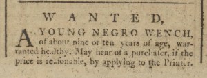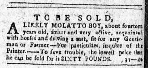 The Slavery Adverts 250 Project chronicles the role of newspaper advertising in perpetuating slavery in the era of the American Revolution. The project seeks to reveal the ubiquity of slavery in eighteenth-century life from New England to Georgia by republishing advertisements about enslaved people – for sale as individuals or in groups, wanted to purchase or for hire for short periods, runaways who liberated themselves, and those who were subsequently captured and confined in jails and workhouses – in daily digests on this site as well as in real time via the @SlaveAdverts250 Twitter feed, utilizing twenty-first-century media to stand in for the print media of the eighteenth century.