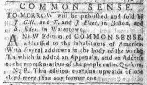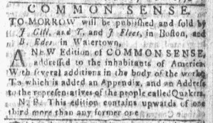 The new advertisement included a clarification about where readers could acquire copies: from “J. Gill, and T. and J. Fleet, in Boston, and B. Edes in Watertown.” The previous version listed only Boston locations, though Benjamin Edes had relocated to Watertown to print the Boston-Gazette there throughout the siege of Boston. Although the British departed on March 17, Edes and the Boston-Gazette remained in Watertown until the end of October. Customers could purchase Common Sense from Edes in Watertown or from John Gill, his former partner in publishing the newspaper, in Boston. In addition, Thomas Fleet and John Fleet, who had printed the Boston Evening-Post before it folded soon after the battles at Lexington and Concord, also sold Common Sense in Boston.