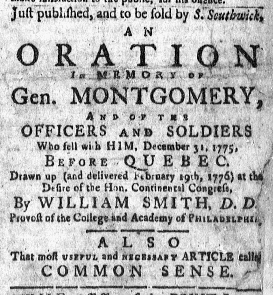The April 8, 1776, edition of the Boston-Gazette featured an update about the local edition of Thomas Paine’s Common Sense announced in the New-England Chronicle four days earlier. On a Thursday, readers learned that “Next week will be PUBLISHED, and to be SOLD … in BOSTON, A New Edition of COMMON SENSE.” The following Monday, an advertisement with a headline that proclaimed “COMMON SENSE” informed the public that “TO-MORROW will be published and sold … A NEW Edition of COMMON SENSE.” In less than a week, the Boston edition went from in the press to in stock and for sale.