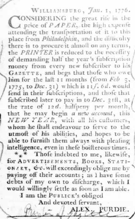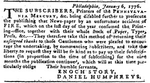 Yet Boston was not the only major port city that saw one of its newspapers cease publication during the first year of the Revolutionary War. Story and Humphreys’s Pennsylvania Mercury lasted less than a year, though disruptions caused by the war did not lead to its demise. Unfortunately, “an unfortunate accident of FIRE … consumed the Printing-office, together with their whole Stock of Paper, Types, Press,” and other equipment on December 31. The situation did not leave any possibility for the partners to recover and eventually resume publication. “[B]eing disabled further to prosecute the publishing [of] that News-paper,” they announced in an advertisement in the Pennsylvania Gazette, they instead expressed “their unfeigned thanks” to the subscribers who had supported the venture and requested that they “will be so kind as to pay up their subscriptions (in proportion to the time of subscribing) for the nine months the publication continued.” In other words, they expected customers to make prorated payments based on the number of issues they received. Humphreys eventually tried again, but not until after the Revolutionary War. On August 20, 1784, he commenced publishing a new Pennsylvania Mercury.