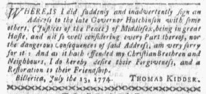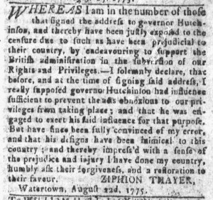 It was yet another apology for signing an address to Thomas Hutchison when General Thomas Gage replaced him as governor of Massachusetts and he departed for England. This time Ziphion Thayer lamented his error in an advertisement in the August 28, 1775, edition of the Boston-Gazette, published in Watertown as the siege of Boston continued. Thayer acknowledged that he signed the address and “thereby have been justly exposed to the censure due to such as have been prejudicial to their country, by endeavouring to support the British administration in the subversion of our Rights and Privileges.” As others indicated in their own apology-advertisements, signing the address came with consequences. The “censure” that Thayer experienced likely included other colonizers refusing to engage with him socially or in business.