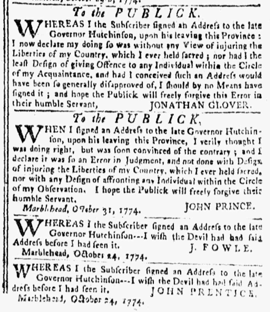 For a time, many signatories who published apology-advertisements claimed that they had affixed their names in haste without reading carefully or fully considering the full implications of the address. More recently, however, others explained that they signed because they thought at the time that Hutchinson had the power to protect them from the “Vengeance of the British Ministry” and an inclination to advocate for American liberties. “I solemnly declare, that before, and at the time of signing said address,” Thayer claimed, “I really supposed governor Hutchinson had influence sufficient to prevent the acts obnoxious to our privileges from taking place; and that he was engaged to exert his said influence for that purpose.”