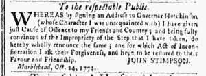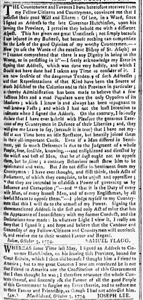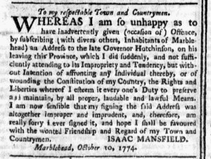 Things certainly did not work out that way, leading Thayer to declare that he had “since been fully convinced of my error” and now realized that Hutchinson’s designs “have been inimical to this country.” Did Thayer have an authentic conversion? Or did he merely say what others wanted to hear so he could return to his former standing in his community? William Huntting Howell contends that the authenticity of such apology-advertisements mattered much less to Patriots than the “rote expression of allegiance” in the public prints.[1] Thayer asserted that he became “impress’d with a sense of the prejudice and injury I have done my country” and, accordingly, he “humbly ask[ed] their forgiveness, and a restoration to their favour.” Whether or not Thayer truly believed the former, he wanted the latter and likely believed that his apology-advertisement would help convince others to overlook what he had done.