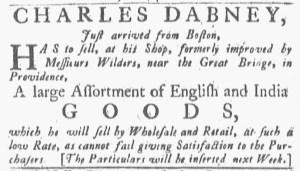Charles Dabney took out an advertisement in the Providence Gazette to announce that he stocked a “large Assortment of English and India GOODS” at his shop near the Great Bridge. He offered his wares “Wholesale and Retail, at such a low Rate, as cannot fail giving Satisfaction to the Purchasers.” In other words, customers would be happy with the bargains they got when they visited Dabney’s shop. He intended to provide a list of his merchandise to demonstrate the choices he made available to consumers, but his initial advertisement in the May 14, 1774, edition did not include “The Particulars.” Instead, the notice stated that those details “will be inserted next Week.” Who made that decision? Perhaps Dabney did not have time to draw up a list of that “large Assortment” before the May 14 edition went to press. Perhaps John Carter, the printer of the Providence Gazette, determined that he did not have space for all the content submitted that week. Dabney’s advertisement may have been the item easiest to truncate.