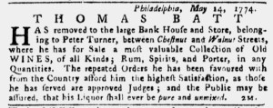 John Mitchell operated an alcohol emporium in Philadelphia in the 1770s. In April 1775, he advertised his “WINE SPIRIT, RUM, and SUGAR STORES” on Front Street, inviting customers in the city and its hinterland to purchase his wares and then retail them at their shops or taverns or enjoy imbibing them at home. To entice prospective customers, he compiled a lengthy list of his current selection along with a pledge to “keep a constant supply of the above Articles” to avoid disappointments associated with selling out of any favorites.