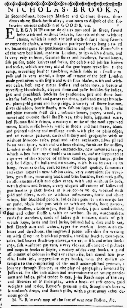 Sause, a frequent advertiser, was already familiar to consumers in New York. A woodcut depicting various kinds of cutlery available at his “Jewlery, Hardware, and Cutlery Store” often adorned his advertisements in newspapers printed in that city. In the summer and fall of 1775, he emphasized “SMALL SWORDS” in his advertisements. Following the outbreak of hostilities at Lexington and Concord in April, residents of New York and other towns did not know what to expect. Many prepared to defend their liberties should the British turn their attention to them. Sause made sure that Patriots in New York knew that he could supply them with various kinds of small swords. He even made a pitch for those items at the end of his advertisement for Romans’s map of Boston: “Swords and Cutteaux de Chase [a short sword], with a variety of Jewellery, Hardware and Cutlery, to be sold at the above Store.”