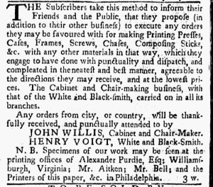 John Willis, a “Cabinet and Chair-Maker,” and Henry Voigt,” a “White and Black-Smith,” launched a new endeavor in the spring of 1775. They took to the pages of Story and Humphreys’s Pennsylvania Mercury to advise “their Friends and the Public,” especially those in the printing trade, that they would “execute any orders they may be favoured with for making Printing Presses, Cases, Frames, Screws, Chases, Composing Sticks,” and other equipment.