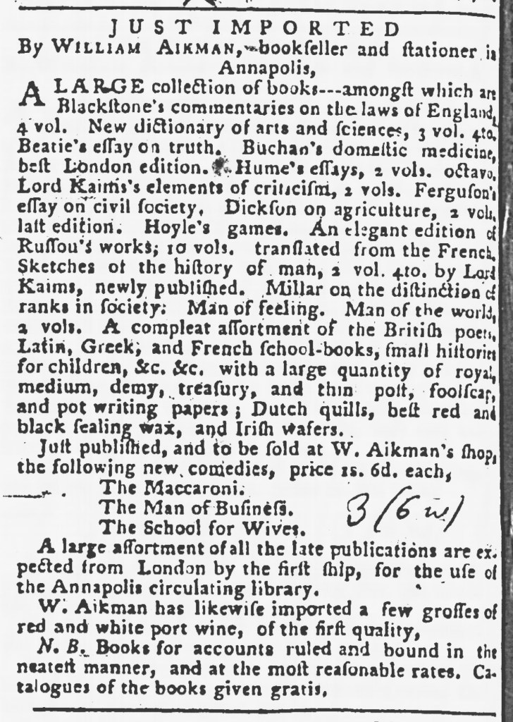 An advertisement by William Aikman, a bookseller and stationer in Annapolis, in the April 13, 1775, edition of the Maryland Gazette proclaimed, “JUST PUBLISHED, And to be sold … JOURNAL of the whole proceedings of the continental congress” and “An essay on the constitutional power of Great Britain over the colonies.” While Aikman no doubt sold those items, they had not been “JUST PUBLISHED,” nor had he published them.