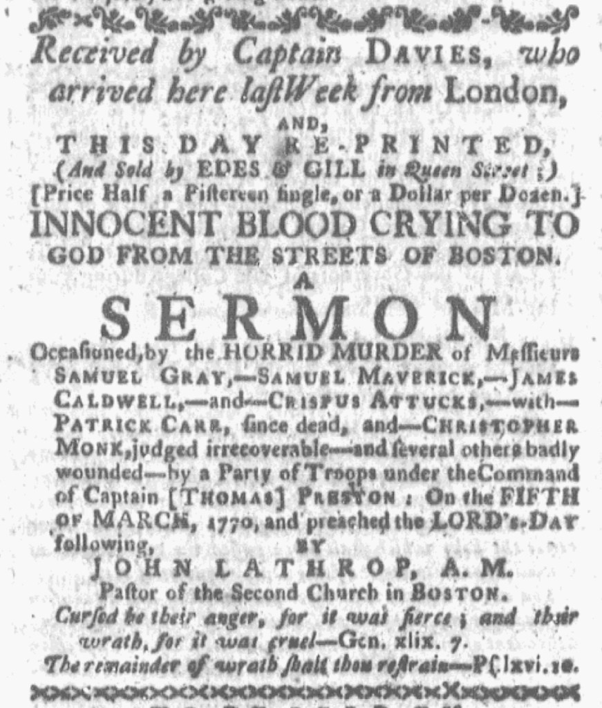 The May 4, 1772, edition of the Massachusetts Gazette and Boston Post-Boy carried a brief advertisement for “The elegant POEM, which the Committee of the Town of Boston had voted unanimously to be Published with the ORATION.” The “ORATION” referred to the address that Dr. Joseph Warren delivered on the second anniversary of the Boston Massacre, an address already published and advertised in several newspapers in Boston and beyond. Why, if “the Committee of the Town of Boston had voted unanimously” to publish it with Warren’s oration, had that not occurred?