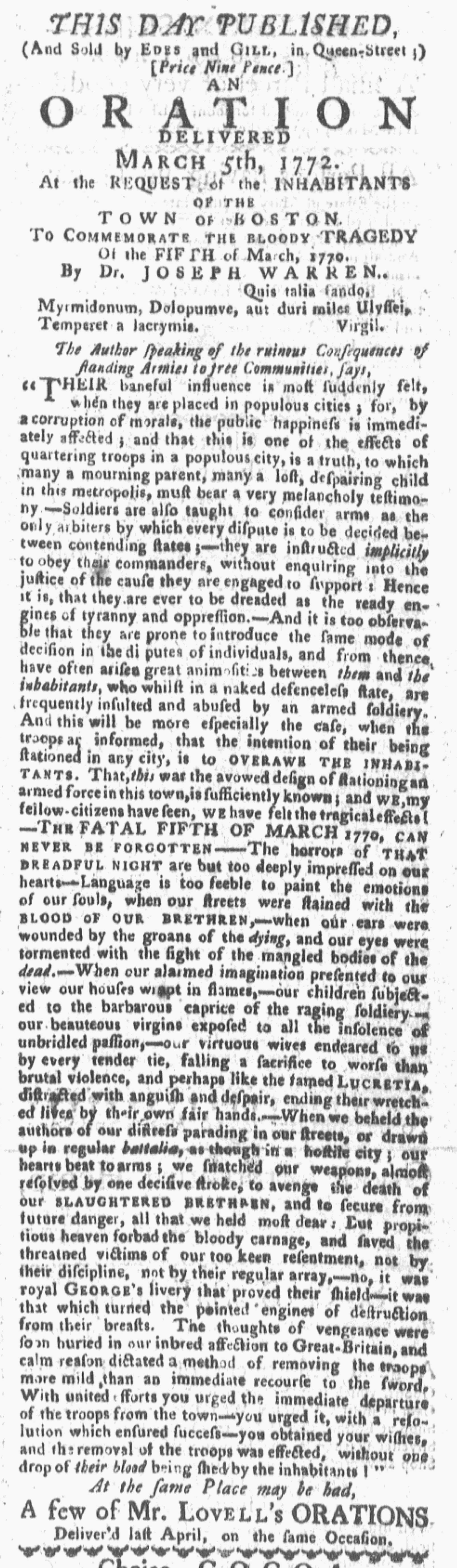“The elegant POEM, which the Committee of the Town of Boston had voted unanimously to be Published with the ORATION.”