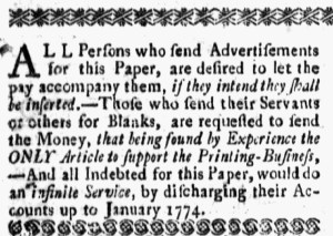 Timothy Green, the printer of the Connecticut Gazette, inserted a brief notice in the February 11, 1774, edition to advise that “Several Pieces from our Correspondents, Advertisements, &c. which came to Hand too late for this Day’s Paper, will be in out next.” In a few short lines, the printer aimed to manage his relationships with subscribers, advertisers, and anyone who submitted news, editorials, essays, or any other content for the newspaper. He suggested to readers that he worked until the last possible moment to include the latest news. He assured advertisers that their notices would indeed appear in print in the next issue. He let those who provided content know that practical matters, not a lack of appreciation for their efforts, played the deciding role in why their submissions did not appear alongside a proclamation from the governor, resolutions from a “Town-Meeting of the Town of Providence” concerning a “Duty upon Tea” enacted by Parliament, and an account of events that resulted in the tarring and feathering of John Malcom, a customs officer, in Boston.