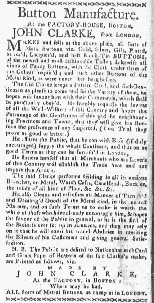 “BUTTONS. MADE and sold … at the Manufactory-house, Boston.”