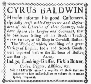 The decorative border around Cyrus Baldwin’s advertisement in the January 16, 1775, edition of the Boston Evening-Postdrew attention to it … and the shopkeeper wanted the entire community to see what he had to say about the “great Variety of English, India and Scotch Goods” that he offered for sale “at his Shop in Cornhill, Boston.” It was a message not only for “his good Customers” but “especially those noble Supporters and Defenders of the Liberties of their Country, who have signed the League and Covenant.” Baldwin could have invoked the Continental Association that went into effect on December 1, 1774, but made an even stronger statement about fidelity to the American cause demonstrated by some of his customers.