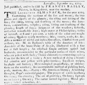 It was a sign of the changing seasons.  As the summer of 1774 came to a close, the first advertisements for almanacs for 1775 began to appear in newspapers, part of an annual ritual.  Each year printers deployed advertisements in weekly periodicals to hawk their annual periodicals.  Francis Bailey, a printer in Lancaster, was among the first to do so in 1774, placing notices in the Pennsylvania Gazette and the Pennsylvania Journal on September 21.  Readers still had more than three months to acquire their almanacs before the new year, yet each year many printers saw opportunities to increase sales and beat their competitors by making the useful and entertaining pamphlets available in the late summer and early fall.  That also allowed plenty of time for shopkeepers to purchase in volume, often receiving a discount, to stock and sell to their own customers.