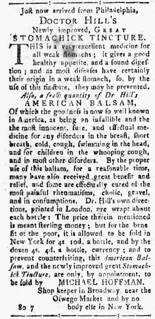 In the spring of 1775, Michael Hoffman took to the pages of the New-York Journal to advertise two patent medicines, “DOCTOR HILL’S Newly improved, GREAT STOMACHICK TINCTURE” and “Cr. Hill’s AMERICAN BALSAM.” Even though he asserted that the goodness of that second remedy “is now so well known in America, as being an infallible … end effectual medicine” for a variety of “disorders,” Hoffman listed symptoms that it alleviated. He also advised that the tincture prevented “most diseases” since they tended to have “their origin in a weak stomach.”