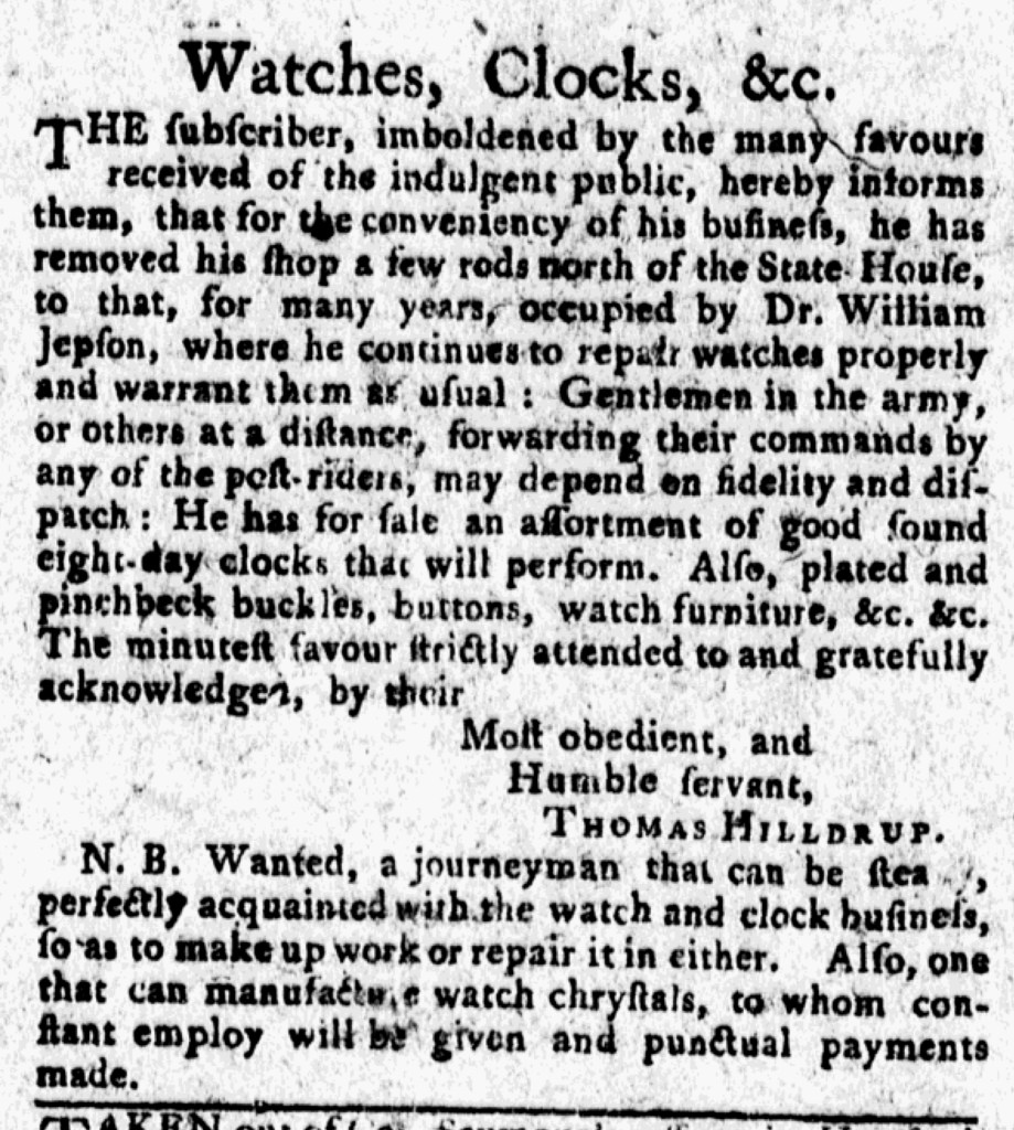 Thomas Hilldrup, a watch- and clockmaker, had a history of running engaging advertisements in newspapers printed in Connecticut in the 1770s. He once again took to the pages of the Connecticut Courant and Hartford Weekly Intelligenceron December 18, 1775, this time informing existing and prospective clients that he had moved to a new location. In framing this announcement, he asserted that he had already built a reputation and earned the trust of many customers. Having been “imboldened by the many favours received of the indulgent public,” Hilldrup declared, he “hereby informs them that for the conveniency of his business, he has removed his shop a few rods north of the State-House, to that, for many years, occupied by Dr. William Jepson.” He supplemented this announcement with assurances about his skill and the quality of his work, stating that he “continues to repair watches properly and warrant them as usual.”
