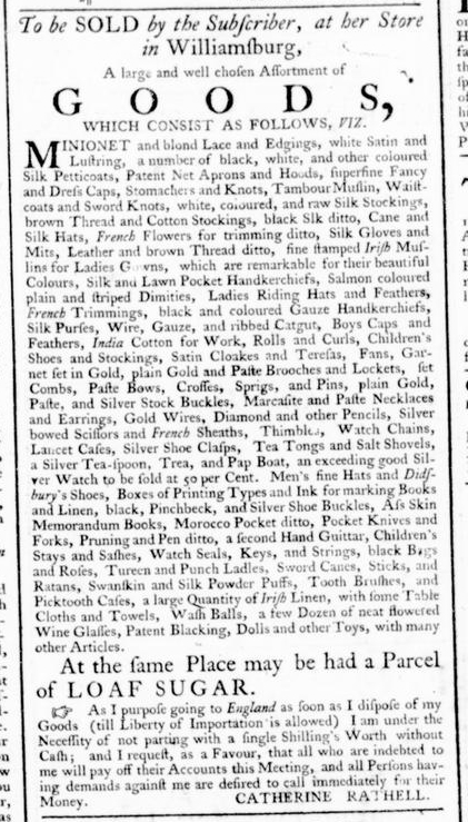 In the spring of 1775, Catherine Rathell advertised a “large and well chosen Assortment of GOODS” available at her store in Williamsburg in John Dixon and William Hunter’s Virginia Gazette. She demonstrated the choices available to consumers with a lengthy list that included “black, white, and other coloured Silk Petticoats,” “fine stamped Irish Muslims for Ladies Gowns, which are remarkable for their beautiful Colours,” “plain Gold and Paste Brooches and Lockets,” “a few Dozen of neat flowered Wine Glasses,” and “Dolls and other Toys.”