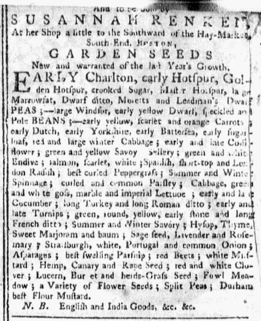 Renken, one of the most enterprising of those female seed sellers, apparently acquired her inventory from a ship that landed at Salem. She identified the captain of the vessel that had transported them across the Atlantic. Adams and Oliver both declared that they sold seeds “Imported from London,” but did not provide additional details to allow prospective customers in the eighteenth century (or historians in the twenty-first century) to reach conclusions about when and how they came into possession of those seeds. Clark and Nowell, on the other hand, made clear that their seeds had been “Imported from LONDON the Spring before the Harbour of Boston was blockade up.” They received their seeds at least nine months earlier, a factor that may or may not have been an advantage. Adams declared that he “warrants [his seeds] good, and of the last Year’s Growth.” Similarly, Renken described her seeds as “New and warranted of the last Year’s Growth.” Clark and Nowell could not make such claims. Instead, they attempted to leverage the date of delivery as a point in their favor. Although not “new,” their seeds also were not so old that they would not germinate, especially if Clark and Nowell had stored them carefully. They asked prospective customers to take into account the challenges that they all faced due to the blockade, hoping that a sense of mutual support would convince consumers to select their seeds over the ones offered by their competitors.