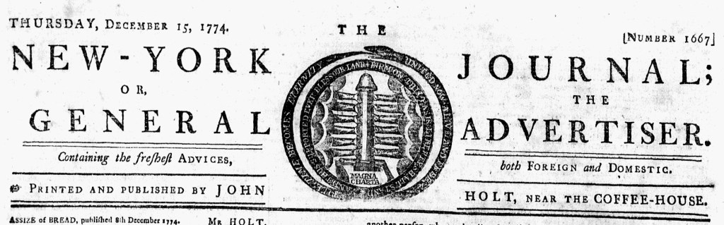 Noel and Hazard may have sold Hugh Gaine’s New York edition of the Proceedings of the First Continental Congress, though the other titles in their advertisement suggest that they could have sold the Philadelphia edition printed by William Bradford and Thomas Bradford. The Bradfords also published Lee’s Strictures and Tennent’s Address, possibly sending copies of all three titles to Noel and Hazard. Either way, the masthead of the newspaper that featured the booksellers’ advertisement suggested that the Bradfords’ edition of the Proceedings made their way to New York. Six months earlier, John Holt, the printer of the New-York Journal, incorporated a political cartoon depicting a severed snake, each segment representing one of the colonies, with the motto “UNITE OR DIE” into the masthead. On December 15, he replaced it with a woodcut depicting twelve hands, one for each colony represented at the First Continental Congress, grasping a liberty pole with a liberty cap perched atop it on a pedestal inscribed “MAGNA CHARTA.” A similar image appeared on the title page of the Bradfords’ edition of the Proceedings, described in Princeton University Library’s online catalog as “the first wood-cut device of the 12 colonies intended to symbolize the need for the true political unity of the colonies.” Holt enhanced that image, having an ouroboros twice encircle the hands and pillar. A message on the ouroboros proclaimed, “UNITED NOW – ALIVE AND FREE – AND THUS SUPPORTED EVER – BLESS OUR LAND – FIRM ON THIS BASIS LIBERTY SHALL STAND – TILL TIME BECOMES ETERNITY.” This addition to his newspaper set the tone for readers to peruse Noel and Hazard’s advertisement, other paid notices, and the news and editorials selected by Holt.
