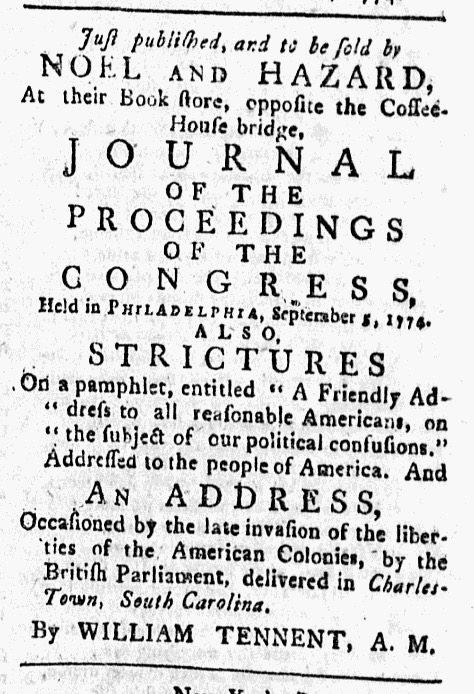 According to their advertisement in the December 15, 1775, edition of the New-York Journal, Garrat Noel and Ebenezer Hazard stocked the “JOURNAL OF THE PROCEEDINGS OF THE CONGRESS, Held in PHILADELPHIA” at their bookstore. They also marketed “STRICTURES On a pamphlet, entitled ‘A Friendly Address to all reasonable Americans, on the subject of our political confusions’” by Charles Lee and “AN ADDRESS, Occasioned by the late invasion of the liberties of the American Colonies, by the British Parliament, delivered in Charles-Town, South Carolina” by William Tennent. The booksellers provided the public access to news and commentary about current events beyond what appeared in the public prints, though they privileged perspectives expressed by Patriots rather than Loyalists.