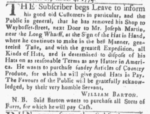 Instead, Barton “inform[ed] his good Customers, and the Public in general, that he still continues to carry on the Hatter’s Business, at his Shop … where Mr. SETH LATHROP will supply all Person … with every Kind of Beaver, Felt and Castor Hats.” Barton did not indicate whether Lathrop previously played a role in the business. Had Lathrop been an employee or an apprentice who now ran the shop while Barton was away? Did he take new orders and make new hats according to the tastes of Barton’s “good Customers” and new clients who responded to the advertisement? Or did he merely sell hats already in stock when Barton enlisted in the army? Barton’s notice did promise low prices, “the cheapest Rates,” and made assurances about the quality of the hats available at the shop, proclaiming that they were “warranted to be good.”