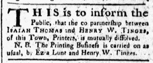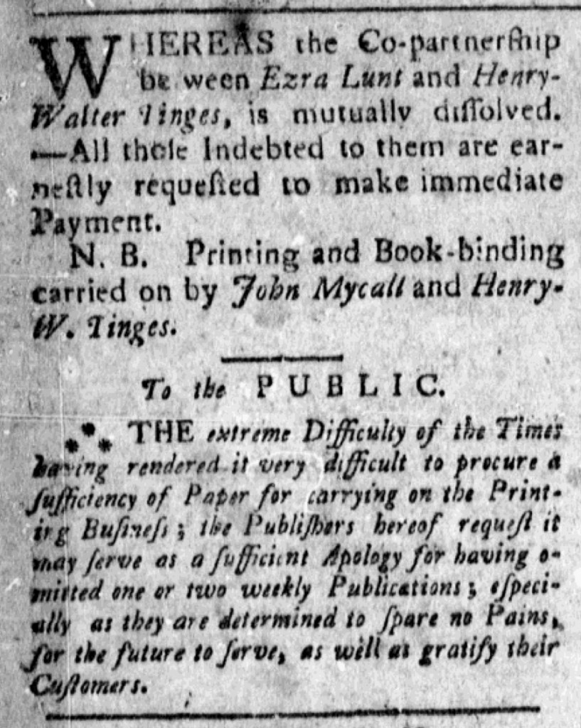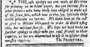 Immediately above the advertisements, the printers inserted their own notice to explain what happened. “THE only apology we can make at this time for printing on no better paper,” Mycall and Tinges stated, “we can borrow from other printers who have lately been obliged to make use of the same sort, which was as they say, because they could procure no better.” They closely paraphrased portions of Fowle’s notice to his readers a couple of weeks earlier: “The only Apology the Publisher can make for this Day’s Paper, is that he could not procure any other.” Mycall and Tinges printed their newspaper on different paper only as a last resort. “We have been at the cost to send [an order for more paper] to Milton this week in order to avoid using this,” they informed readers, “but without success.” With the disruptions and displacements that occurred in the six months since the battles at Lexington and Concord, securing paper became difficult. The printers tried to get more from the paper mill on the Neponset River in Milton, but to no avail. They expected their readers to understand, especially those who held the right sort of political principles. “We hope we need make no further apology to those who are real friends to their country,” Mycall and Tinges proclaimed, “as we are determined to us [the substitute paper] no oftener than necessity requires.” They hoped that readers would see the smaller newspaper as a minor inconvenience given the stakes of the contest between the colonies and Great Britain. They did their best with the resources available to continue to disseminate news and advertising to their subscribers and other readers.
